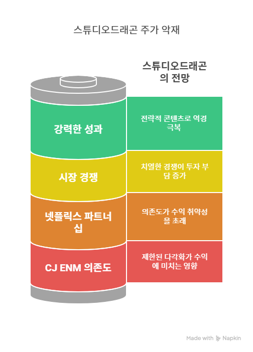스튜디오드래곤은 넷플릭스와의 협업으로 매출의 절반 이상을 창출하지만, 2022년 파트너십 만료 우려가 제기되었다. CJ ENM이 TVING에 집중하며 넷플릭스와의 협업이 약화될 가능성이 있다. 넷플릭스는 ‘사랑의 불시착’, ‘사이코지만 괜찮아’ 등 주요 작품의 수익원이었으나, 2024년 대작 부재로 판매가 감소하며 역기저 효과가 나타났다. 넷플릭스 의존도 감소는 단기적으로 매출에 부정적인 영향을 미칠 수 있으며, TVING 중심 전략이 성공하지 못할 경우 리스크가 커진다.