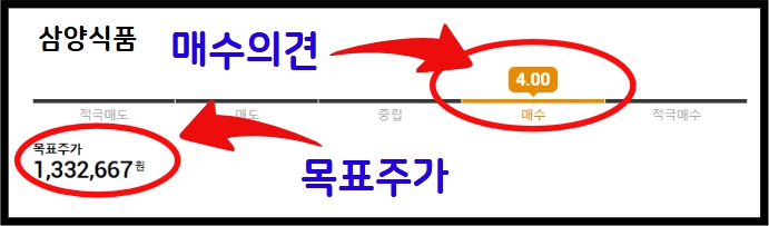 주식을 투자하는데, 내가 관심있는 주식의 적정주가를 알면 아주 큰 도움이 됩니다. 현재 주가가 적정주가 보다 낮으면 저평가 됐으니 주식을 사거나 가지고 있으면 됩니다. 반대로 현재 주가가 적정주가 보다 높으면 팔면됩니다. 증권사 전문가들이 기업의 제무재표와 상황을 분석하여 목표주가를 제시합니다. 게다가 적극매도, 매도, 중립, 매수, 적극매수 의견도 제안합니다. 많은 주식 투자자들이 목표주가를 투자의 기준으로 삼기도 합니다. 아래 이미지는 증권사 전문가들이 제시한 삼양식품의 목표주가와 투자 의견입니다.