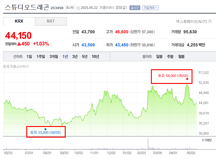 - 2025년 3월 초 ~ 5월 초: 2025년 3월 초부터 5월 초까지 주가는 다시 가파른 상승세를 보이며 5월 2일 54,000원의 최고가를 달성했다. 이는 신작 공개, 글로벌 OTT 플랫폼과의 협력 강화, 또는 기업의 펀더멘털 개선에 대한 기대감이 재차 높아지면서 투자자들의 매수 심리가 강화된 것으로 분석된다.