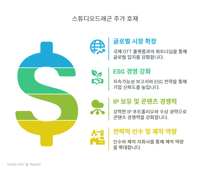 - ESG 경영을 강조하며, 2022년 지속가능경영위원회를 신설해 콘텐츠를 통한 사회적 가치 창출과 노동환경 개선을 추진한다. 스튜디오드래곤은 글로벌 메이저 스튜디오로의 도약을 목표로, 지속적인 IP 확장과 해외 협업을 강화하며 K-드라마의 영향력을 확대한다.