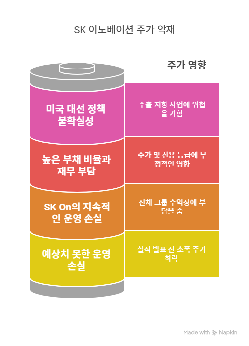 2024년 11월 미국 대선 결과는 SK이노베이션의 배터리와 에너지 사업에 불확실성을 더한다. 트럼프 행정부의 재선 시 캐나다·멕시코산 원유에 대한 관세 정책은 아시아로의 원유 공급 증가를 초래할 수 있으나, 보호무역주의 강화는 SK On의 북미 배터리 수출에 부정적인 영향을 미칠 가능성이 있다. 하나증권은 미국 관세 정책의 불확실성이 SK On의 시장 전망에 리스크를 초래한다고 분석했다. 이는 SK이노베이션의 수출 중심 사업 구조에 잠재적 위협으로 작용한다.