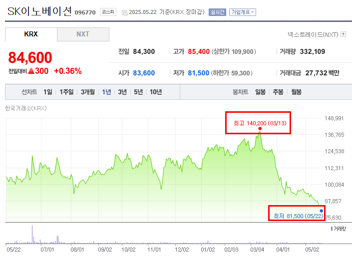 - 2024년 9월 초 ~ 2025년 3월 중순: 2024년 9월 초부터 2025년 3월 13일까지 SK이노베이션의 주가는 가장 강력하고 꾸준한 상승세를 나타내며 140,200원의 최고가를 달성했다. 이 장기적인 상승 추세는 국제 유가 상승, 에너지 전환 관련 자회사들의 성장 기대감, 배터리 사업의 가치 상승, 또는 실적 개선에 대한 기대감 등 복합적인 긍정적 요인들이 작용한 결과로 판단된다.